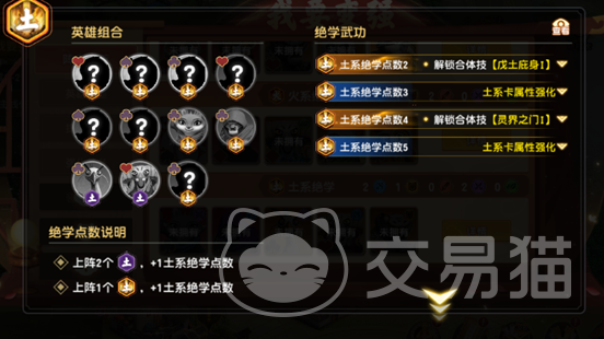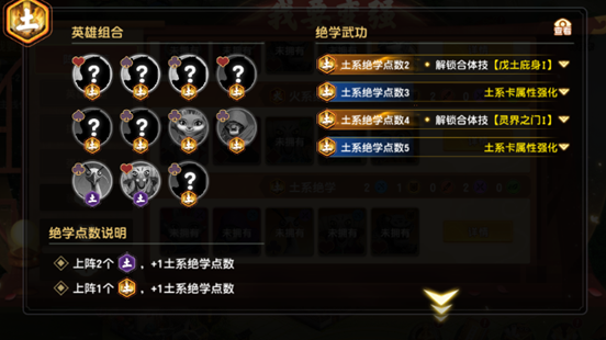 ⑤土系绝学(含土系绝学·残):共11名英雄,满羁绊需累计5点绝学值(1名完整土系=1点,2名土系·残=1点)