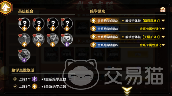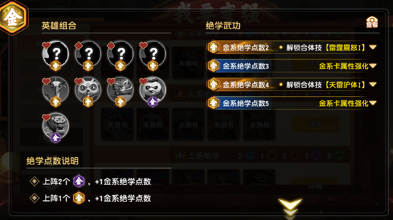 ①金系绝学(含金系绝学·残):共9名英雄,满羁绊需累计5点绝学值(1名完整金系=1点,2名金系·残=1点)
