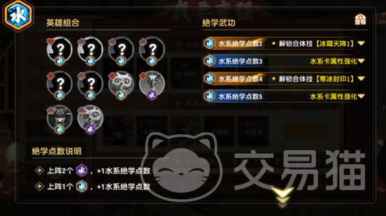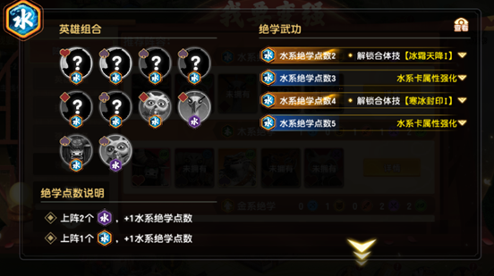 ③水系绝学(含水系绝学·残):共10名英雄,满羁绊需累计5点绝学值(1名完整水系=1点,2名水系·残=1点)