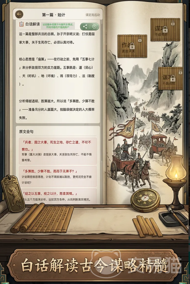 区别于传统战棋或卡牌类玩法,本作首次构建起高度拟真的古代军事决策环境。玩家将化身统帅,在还原真实历史语境的战场中,依据《孙子兵法》十三篇的核心思想——如“知己知彼”“避实击虚”“因敌制胜”等原则,实时应对瞬息万变的战局。是选择“出其不意,攻其不备”的奇袭战术?还是践行“上兵伐谋,其次伐交”的顶层博弈?每一次抉择,皆关乎胜负走向。