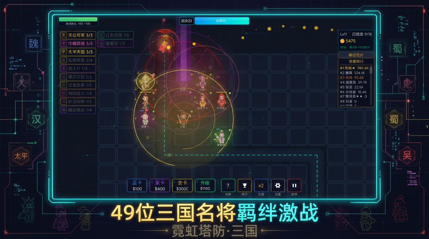 《霓虹塔防·三国》以“主公统御”为叙事起点,玩家需调度关羽、诸葛亮、吕布等经典武将组建防御阵线。区别于传统塔防的固定炮塔布局,本作中每位武将均具备独立定位(如输出、控制、辅助)与差异化技能体系,强调阵容协同与战场应变能力。