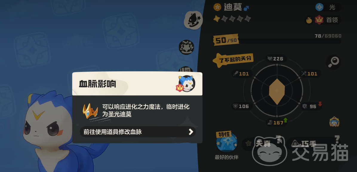 想要将普通迪莫进阶为圣光形态,需完成特定材料收集与进化流程。首要任务是挑战首领级野生精灵:霹雳旋风鼠与火爆猴。二者掉落“首领血脉碎片”的概率较高。累计收集满10枚碎片后,前往炼金台合成专属进化药剂。获得药剂后,请勿直接使用,需打开背包,进入迪莫详情页,点击进化入口,触发专属进化战斗。该战斗机制设计合理,操作响应及时即可顺利通关,成功解锁圣光迪莫。