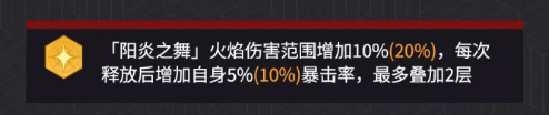 特技「阳炎之舞」具备全自动索敌与范围控场能力。技能周期性触发,召唤一道随机落点的火焰,落地后对范围内敌人造成300%攻击力的魔法伤害,并附加1秒眩晕效果。该机制完全免操作,在面对多目标场景时大幅降低操作压力。经奥义强化后,火焰作用半径提升10%–20%,且每次释放后为自身叠加5%–10%暴击率,最多可叠加2层。随着战斗推进,其暴击能力稳步提升,后期输出曲线持续上扬。