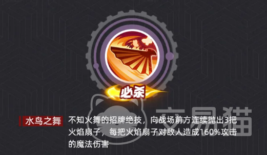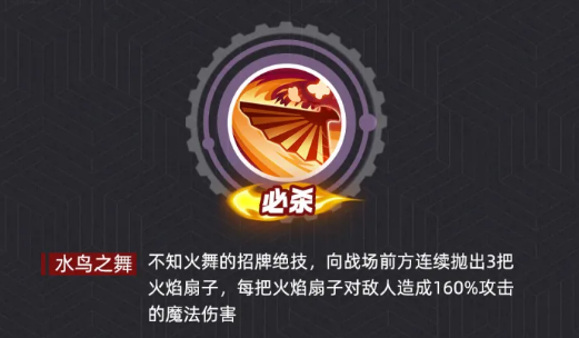 核心爆发技能「水鸟之舞」是其输出基石。该技能释放后,向前方连续投掷3枚附带烈焰的扇子,每枚造成160%攻击力的魔法伤害,总计达480%。在奥义加持下,首次释放所需怒气值降低10%至20%,显著提升连招频率;同时,每次施放可额外增加1–2枚扇子,使总伤害呈阶梯式增长。该技能并非视觉华丽但实战疲软的类型,合理配置奥义后,实际清场效率极为突出。