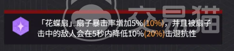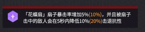 战技天赋「花蝶扇」提供高频额外伤害。攻击时有40%概率触发,释放一枚火焰扇子,造成300%攻击力的魔法伤害。虽为概率型效果,但在节奏紧凑的副本或BOSS战中,实际触发频次稳定可观。奥义系统内设有专项强化:提升该扇子暴击率5%–10%,且命中目标后使其在5秒内击退抗性下降10%–20%。该减抗效果与「水鸟之舞」形成强力协同,大幅提升后续扇类技能的控制衔接与伤害转化效率。