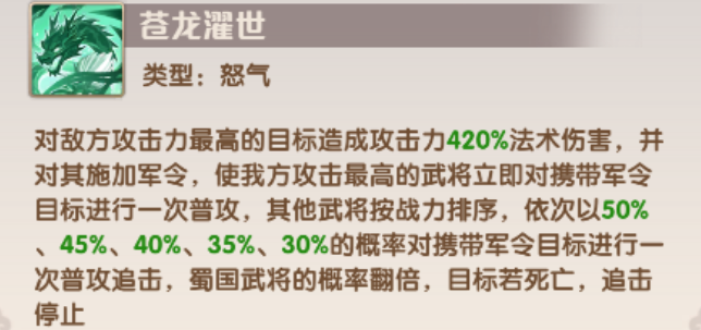 其怒气技能具备锁定目标攻击力的判定逻辑,释放后造成高额法术伤害。该技能附带“尊令”效果——当队伍中攻击属性最高的武将完成普攻后,其余武将将依战力由高至低依次发动追击;且蜀国武将在该连锁中触发追击的概率显著提升,直至目标单位被彻底消灭。这一机制深度契合蜀国阵营强调“多段联动、集火速杀”的战术内核。
