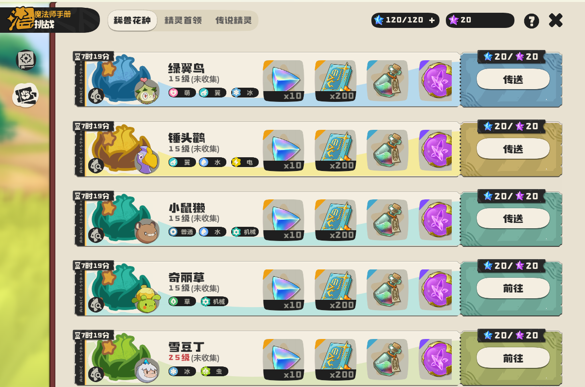 玩家可通过游戏内“魔法师手册”模块中的【挑战】子栏目直接查阅全部稀兽花种列表。该界面同步整合了精灵首领及传说精灵分类,支持一键传送至对应栖息地图,大幅降低探索成本。所有稀兽花种均按等级梯度分组呈现,便于玩家依据自身战力合理规划挑战顺序。