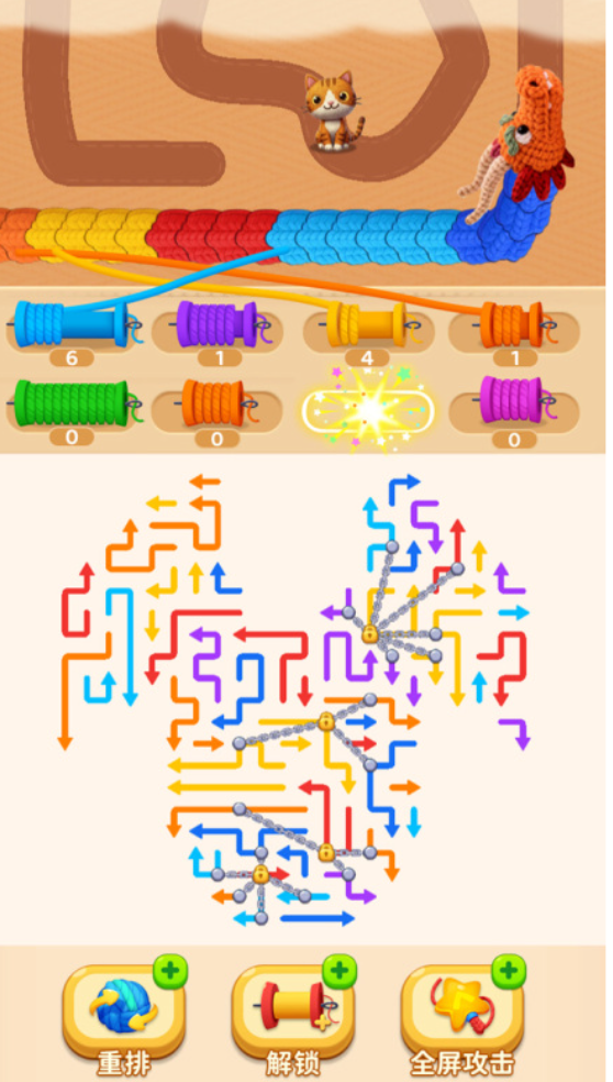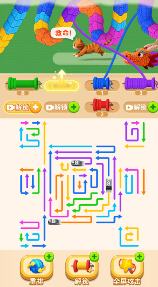 在《箭头超解压》中,核心玩法围绕动态棋盘展开。画面下方呈现高度交织的箭头蛇形阵列,形似难以理清的缠绕线团;玩家通过滑动操作调整箭头朝向,引导能量流有序传导,最终汇聚为有效弹药,精准阻击上方路径中不断逼近的巨龙——而它所威胁的目标,正是被守护的猫咪。每一步方向调整均影响弹药类型与输出强度,操作响应速度与策略预判精度共同决定战局走向。