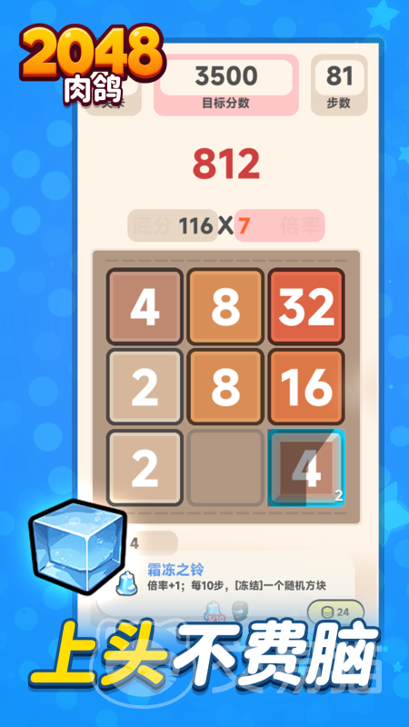 游戏基础规则延续数字合成逻辑:玩家通过上下左右滑动操作,使相同数值方块两两合并,目标为达成2048。区别于传统版本,本作嵌入多重Roguelike特性——每局开局地形、方块生成序列、特殊道具分布均完全随机;过程中可触发炸弹方块(清除相邻格子)、幸运方块(直接升阶指定数字)等变量机制,大幅增强不可预测性与临场决策压力。