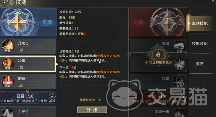 在技能等级分配上,狂暴流推荐顺序为:【狂暴打击】>【旋风斩】>【战吼】>【冲锋】>【防御姿态】。其中狂暴打击作为单体爆发最强技能,应始终维持最高等级;旋风斩保障AOE能力;战吼提供团队支持;冲锋与防御姿态则作为功能型补充,保证机动性与容错空间。此配置可使狂战士在BOSS战中打出高额连续伤害,同时兼顾小怪清理效率。
