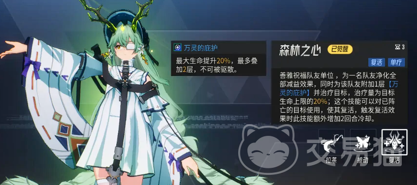 善雅的大招“森林之心”为核心战略技能,兼具增益、治疗与复活三重功能。释放后,为目标施加“万灵庇护”状态,初始提供相当于自身最大生命值16%的治疗量——该数值等同于四阶“凝露”的基础治疗水平,意味着大招在未强化状态下即具备高阶辅助效能。
