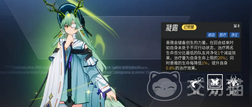 二技能“凝露”为回合结束触发的群体辅助技。施放时,善雅自动选取当前生命比例最低的两名队友进行治疗,基础治疗量为自身最大生命值的16%。该技能具备生命越低、治疗越强的动态机制:每损失1%当前生命值,治疗量额外提升0.8%。技能升级后,基础治疗比例与增幅系数同步优化——2级时基础治疗提升至最大生命的40%;3级起,增幅系数稳定为0.7%;4级与5级则回归0.8%增幅,但整体治疗阈值与容错空间显著扩大,使善雅在残血状态下仍能发挥超常恢复效能。