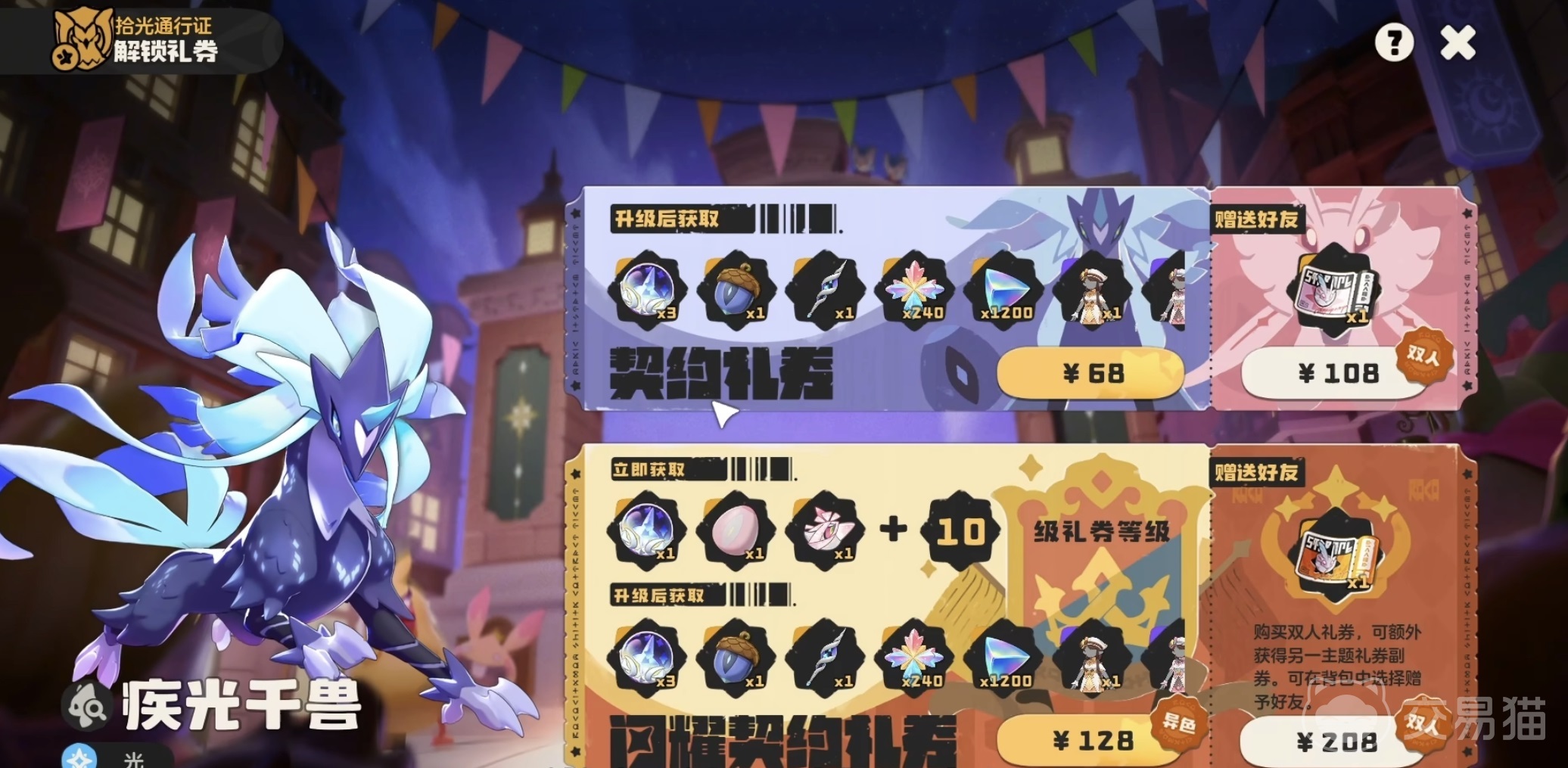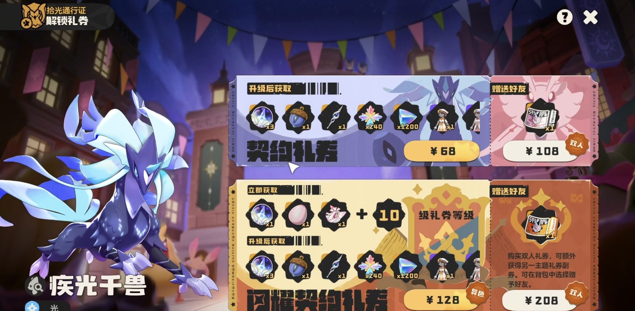 普通版通行证包含以下关键资源:战令精灵果实二选一(绒仙子或疾光千兽)、三颗织梦棱镜球(赛季限定道具,具备100%捕捉成功率,并可稳定触发炫彩形态与“了不起天分”特性)、两套紫色赛季时装、12张传说印记、240点愿望星星,以及经验果、进化材料等基础养成资源。豪华版则在上述全部内容基础上,额外增加五项专属权益:织梦棱镜球数量提升至四颗;独占战令精灵异色蛋(全服唯一获取途径,无其他渠道可得);专属战令头像框;战令等级直升10级(大幅缩短高等级奖励获取周期);以及一份增配的养成资源补给包。