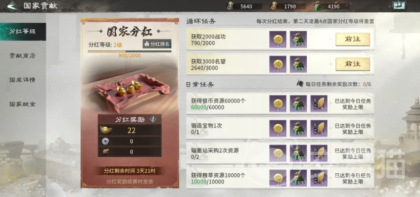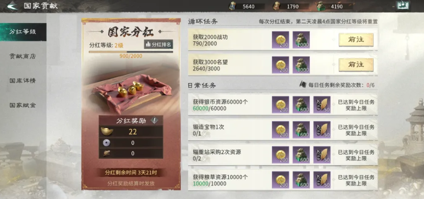 国家贡献系统设有明确的分红等级体系,每日日常任务务必完成,操作门槛低但收益稳定。其中民心类任务属高优必做项,因其关联木材、铁矿等基建刚需资源的定向兑换。战功主要来源于攻城及野外PVP/PVE战斗;名望则需通过副本挑战获取,名望等级提升后可解锁更高级别称号与属性加成。铁矿为建筑升级硬性消耗,木材则是城市扩建的基础材料,二者均需通过民心持续补充。