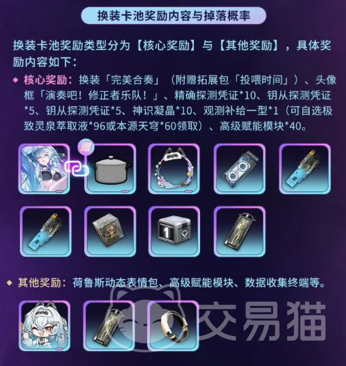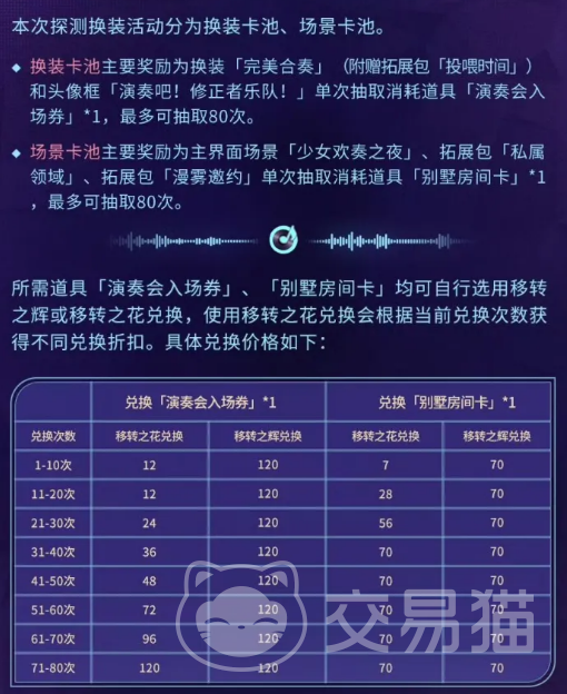 本次活动设置双轨抽卡系统:换装卡池使用「演奏会入场券」进行抽取,单池上限80次,核心产出为「完美合奏」换装及头像框「演奏吧!修正者乐队!」;场景卡池则消耗「别墅房间卡」,同样上限80次,主要掉落「少女欢奏之夜」主场景、「私属领域」与「漫雾邀约」三项内容。两类道具均支持使用移转之花与移转之辉兑换,且兑换比例随累计抽取次数提升而优化;活动结束后未使用的道具将按1:1比例返还原始兑换材料,确保资源零损耗。