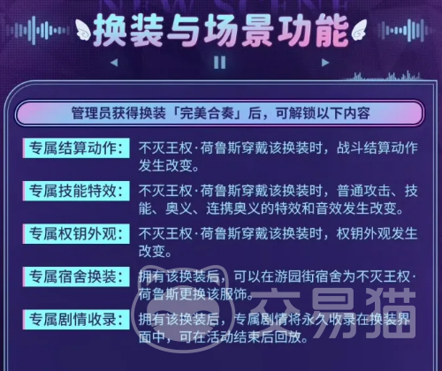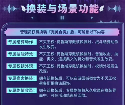解锁「完美合奏」后,将同步激活多项专属内容:包括独立设计的战斗结算动作、重制后的普通攻击与技能特效、适配的新版权钥外观;同时开放游园街宿舍专属换装界面,并收录一段限定剧情。整套换装覆盖战斗表现与日常交互两大维度,角色在主界面、副本场景及宿舍中的视觉呈现均发生显著变化。