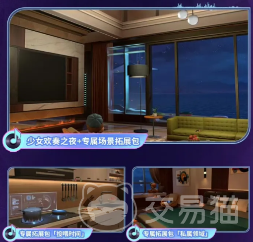 「少女欢奏之夜」基础结构包含客厅与地下排练室两大常驻区域。另有四个拓展模块可供逐步解锁:「投喂时间」(厨房互动)、「私属领域」(卧室空间)、「贪嘴鲨鱼」(策略类小游戏)、「漫雾邀约」(浴室主题互动)。其中「投喂时间」作为换装附赠内容自动获取;「贪嘴鲨鱼」通过连续登录2日即可免费领取;剩余两项拓展需通过对应卡池抽取获得。