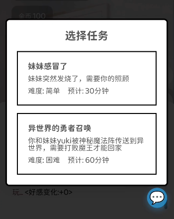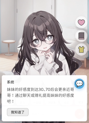 游戏支持玩家以哥哥或姐姐身份开启与Yuki的日常共处旅程,所有交互设计均围绕情感关系构建展开。好感度与信任度作为双轨成长指标,直接影响剧情分支走向、事件触发阈值以及骰子判定权重,形成闭环反馈系统。