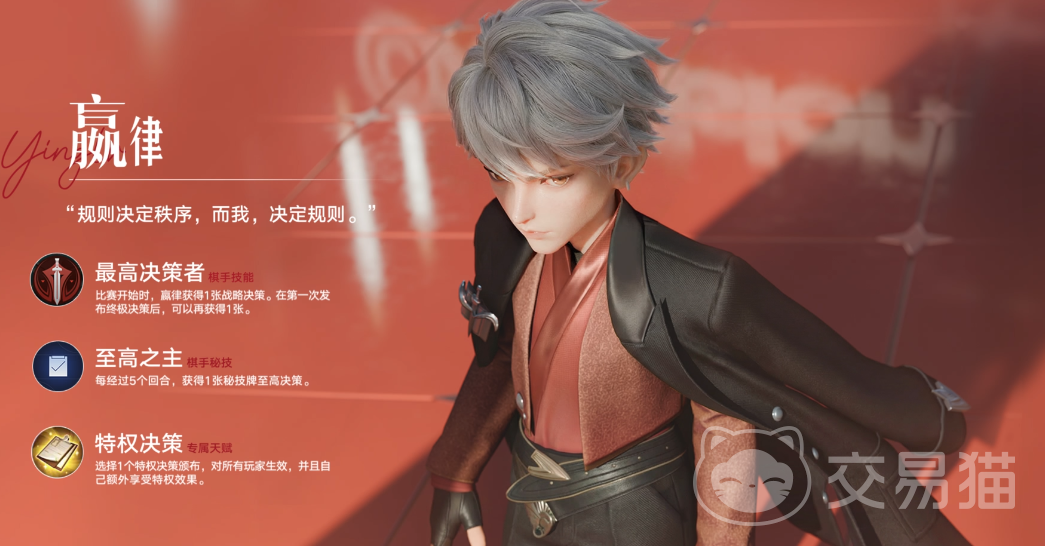 本次终测唯一新增角色为嬴律——一位以宏观调度与战略预判见长的高阶棋手。其核心技能包括【最高决策者】、【至高之主】与【特权决策】,在实战中展现出极强的局势掌控力与节奏主导能力。