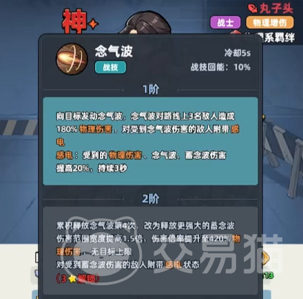 丸子头的核心优势在于其稳定的真伤机制与双重增伤体系:职业特性提供25%基础伤害加成,幸存者特性额外提升10%物理伤害,二者叠加显著放大初始输出阈值。她的主动技能“念气波”为直线三格范围物理攻击,单次造成180%攻击力伤害,并可对命中目标附加持续3秒的感电状态——后续所有念气波对该目标伤害提升20%,构成高效的起手衔接与爆发前置条件。