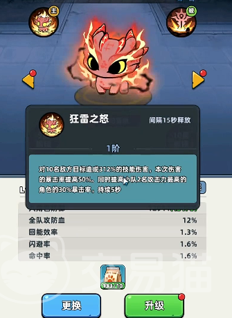宠物编队采用三格布局,分别对应1号位(主输出)、2号位(副输出/暴击强化)、3号位(功能补足)。推荐优先选用红色品质神话级宠物,其初始属性与成长上限均为当前最高;若暂未集齐红宠,可选用黄色品质传说级宠物过渡。主流搭配思路为:1号位固定使用宙斯之鹰——全服强度顶尖的神话级输出宠,具备高额单体爆发与稳定技能覆盖率;2号位可在尼伯雷根与小翼之间择一配置,前者提供全局暴击率加成与怒气加速,后者以高攻速与攻击增幅见长,适合前期快速成型;3号位推荐达达,作为传说品质中综合属性较优的选择,亦可替换为极光龙——后者拥有群体伤害+每10秒触发一次全队增伤的被动机制,升星至满阶后可叠加三层,总计提供30%伤害加成。