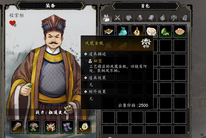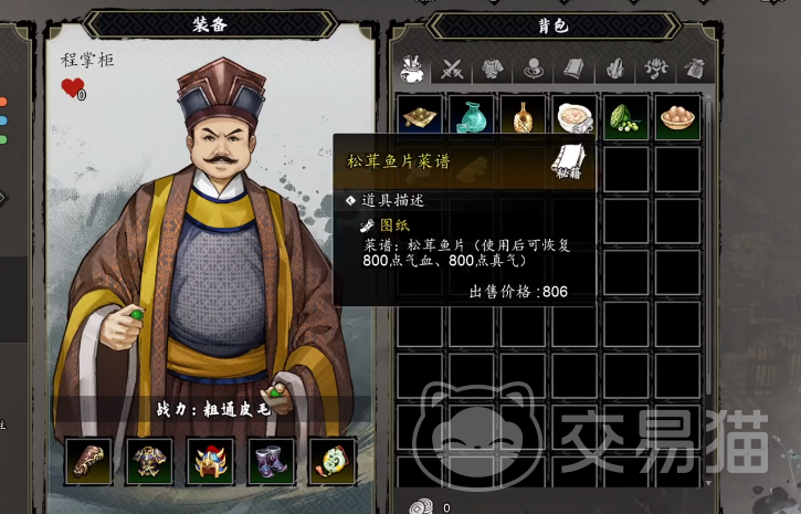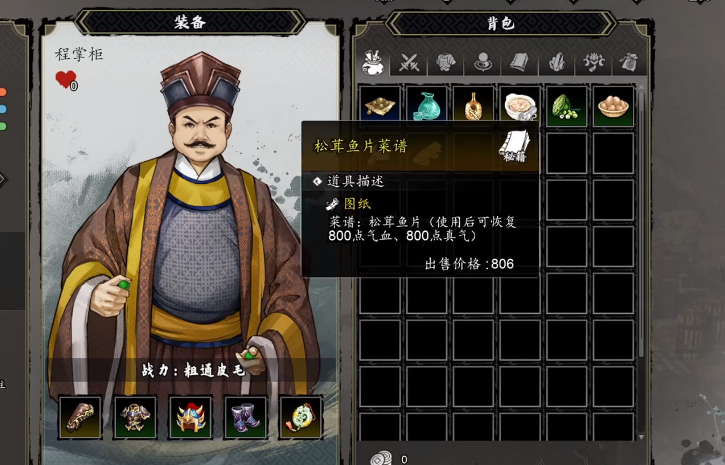 需注意的是,赠礼仅能提升亲密度,并不能免除购买费用;当玩家资金充裕时,可直接向程掌柜支付银两购得所需物品。另一条高效路径是发起挑战:战胜程掌柜后,他将无偿赠予凤凰金瓶与松茸鱼片菜谱各一份。鉴于其未加入门派且整体战力薄弱,该挑战对多数中后期玩家而言难度极低,属零成本获取的理想方案。