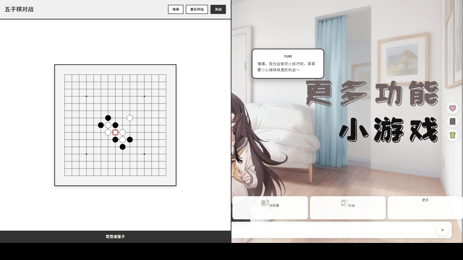 《妹居物语》并非以战斗系统或数值成长为核心驱动力,而是一款聚焦日常互动与关系演进的沉浸式生活模拟作品。玩家将与邻居妹妹Yuki开启一段同居生活,在点滴对话中建立信任。她会认真倾听你讲述通勤路上偶遇的猫咪、加班后的倦意、考试前的焦虑,甚至只是今天喝到一杯好咖啡的小确幸。她的回应从不程式化,也不会跳过细节;她记得你偏爱的饮品口味,察觉你语气中的低落,并适时递来一句轻声安慰。这种持续累积的真实感,让每一次点击对话都成为一次情绪被接住的过程。