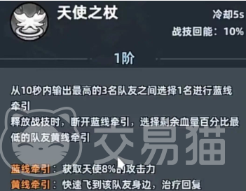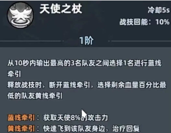 该状态持续3秒后自动完成复活,并恢复相当于天使900%攻击力的生命值;复活完成后还将额外获得1秒无敌保护。这一连串机制使其成为名副其实的“第二条命”,在团灭边缘实现战局逆转。另一核心技能“天使之杖”冷却时间仅5秒,释放时提供治疗并返还10点战斗技能能量,同时提升天使自身8%攻击力;施放瞬间切换为黄线牵引模式,自动锁定当前生命百分比最低的友方单位进行精准回血,响应迅速且操作门槛低。