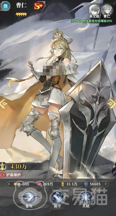 第二位是曹仁,定位为战术型守护者。主动技能可对单体目标造成200%攻击力伤害,并为一名我方单位施加等同于其最大生命值5%的护盾,持续两回合。关键机制在于:护盾施加瞬间,可将目标身上所有减益状态转移至自身承担。由于曹仁自身承伤阈值较高,该机制使其成为净化流与反控体系中的不可替代支点。