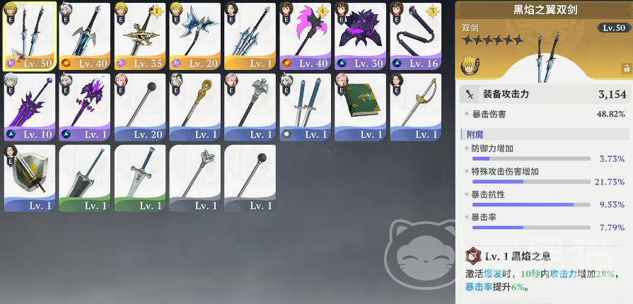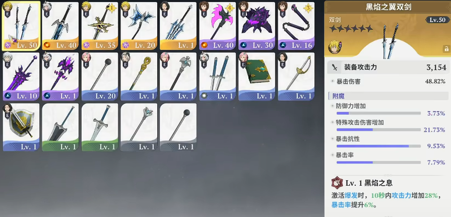 首推黑焰套装。该套装以高爆发输出为核心定位,适配主力DPS角色。其核心武器“黑焰之翼”在攻击力单项评级中达到S级标准,可触发持续20秒的强化状态:攻击伤害提升24%,暴击率额外增加20%。该效果对技能循环紧凑、爆发节奏明确的角色尤为契合,能有效放大被动技的连锁增益,进一步释放角色上限潜力。