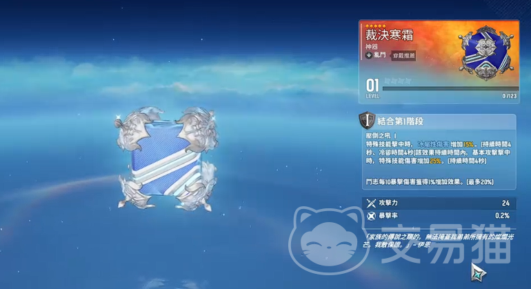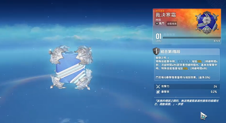 当前版本角色性别分布以女性为主,男性角色数量较少,但所有角色均采用高精度美术建模。在神器适配方面,前期泛用性较强的推荐为五星神器【裁决寒霜】:装备后,角色释放技能时附加15%冰属性伤害,持续4秒;期间每次命中敌人,还可额外提升25%特殊技能伤害。该效果对多数近战输出角色均有显著增益。若搭配冰系角色,则可触发属性共鸣,进一步放大实战表现。