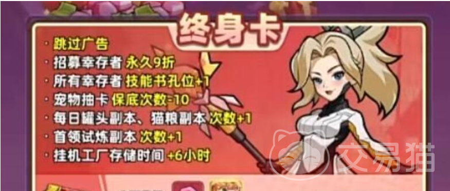 长期活跃玩家可关注终身卡权益:除永久关闭广告干扰外,还包含稀有角色购置折扣、专属技能槽位解锁、副本次数+2、宠物抽取保底次数下调等深度优化项。虽单价较高,但按180天使用周期折算,日均成本低于多数月度订阅服务;