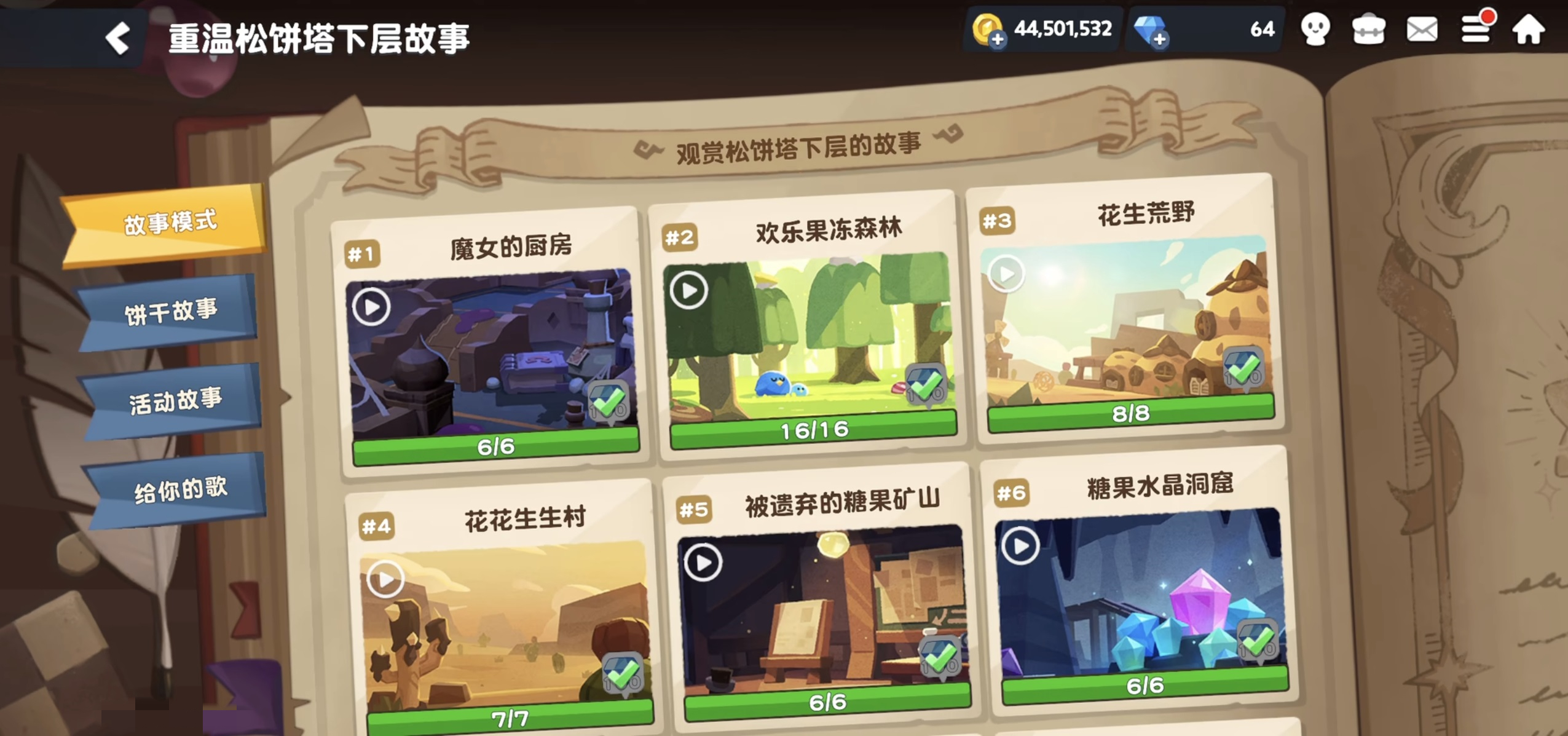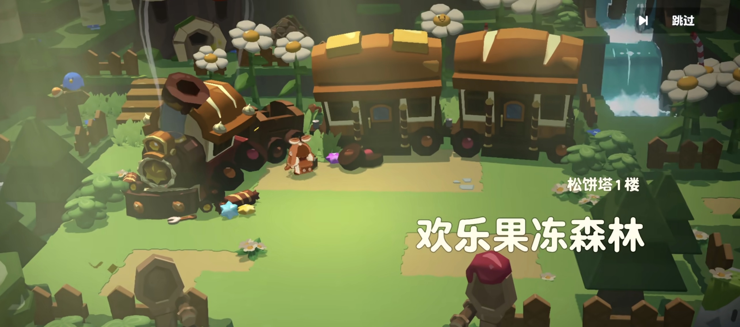 松饼塔一楼的主题设定为“甜品森林”,整体场景呈现清新明快的绿色调,遍布巨型拟态花朵。关键机制在于周期性吹拂的风力场:部分花朵会规律性喷发强风,可推动角色跃升至高台或隐藏平台,但若判断失误,亦可能被卷入下方陷阱区域。本层敌人为基础小怪,属性设定为低血量、低攻击力,适配新手熟悉战斗手感。初始出战角色为勇敢饼干,其普攻连段流畅,技能具备范围伤害与短CD特性,常规清怪无需复杂操作。场景中若出现蓝莓鸟标识,则提示邻近存在隐藏宝箱;击破木桶、击败巡逻敌人等交互行为均可获取金币、材料等实用资源。此外,本层设有三项星级挑战目标:限时通关、全要素收集(含宝箱、道具、彩蛋点)、全程零阵亡,全部达成后方可解锁完整星评奖励。