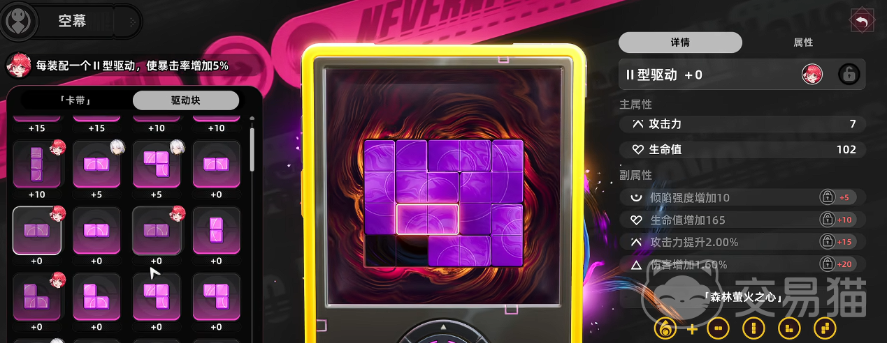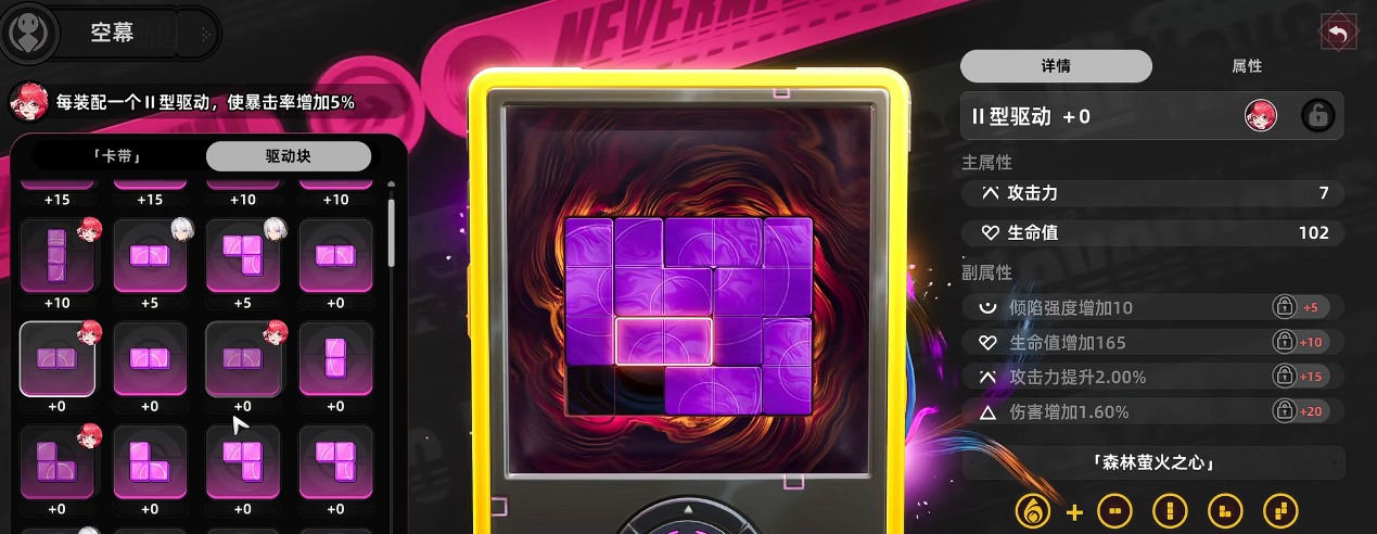 角色成长路径围绕战力进阶展开,搭载多重强化机制。“空幕系统”为核心成长模块之一,由“卡带”与“驱动块”两类组件构成,采用类俄罗斯方块的空间布局逻辑。玩家需依据战斗需求,动态规划卡带插槽分布与驱动块嵌入位置,通过空间效率最优化来提升角色实战表现。