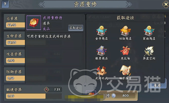 资质重修机制为培养容错提供重要保障。若初始资质与目标养成方向不匹配,可通过重修系统重新洗练基础资质。重修后的真实资质以界面外圈绿色数值为准,而非默认显示的白色基础值。每次重修有概率触发“灵光一闪”特效:成功时,当前资质将跃升至该属性理论最高值。普通武将单次重修最多触发12次灵光一闪;极品武将上限为28次。当总资质综合达成95%以上时,即判定为游戏中稀有的“极品”品质武将,其各项成长系数与满配潜力均为全服顶尖,强烈推荐编入主力阵容并投入核心资源进行深度养成。