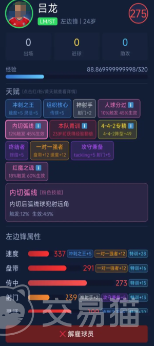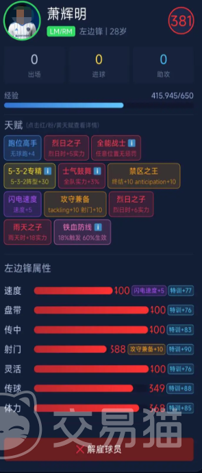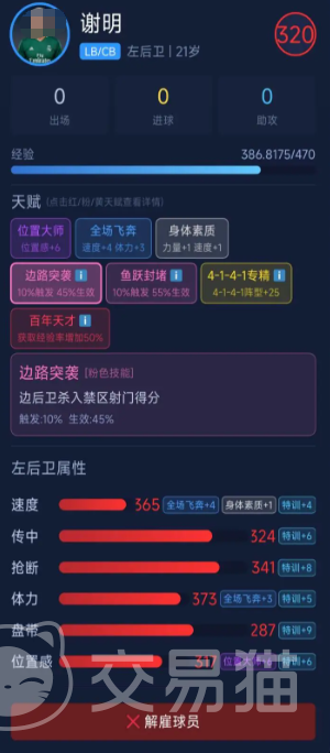 最后推荐左后卫谢明,最高评分为320分。其核心打法为边路前插突袭,当前射门生效概率为45%。通过专精加点与定向特训,该数值可持续提升。天赋“百年天才”带来经验值获取速度+50%的全局加成,加速整体成长节奏;“全场飞舞”则同步提升速度与体力两项基础体能指标,保障其在攻防转换中持续保持高强度覆盖能力,适配三中卫或四后卫体系下的翼卫角色。