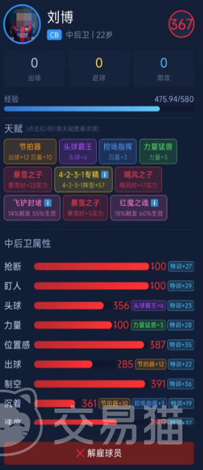 首位推荐球员为中后卫刘博,当前综合评分为362分。其防守端关键属性表现均衡:抢断、盯人、位置感与制空四项均处于同评分段前列水平。天赋配置上,“节拍器”可提升出球能力12点,“沉着”进一步强化场上决策稳定性。该组合使其具备良好的后场组织传导能力;当触发“转基因”进阶效果后,飞铲与封堵拦截成功率显著增强,尤其在对方前锋起脚射门瞬间,能高效覆盖禁区中路区域,形成实质性屏障。