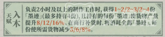 首项天赋名为「入木」,其运作围绕特殊状态「墨迹」展开。当王羲之执行时长≥2小时的制作类工作时,每次任务完成可获得1–2点「墨迹」;该数值随天赋等级提升而增长,最高上限为4点。处于「墨迹」持有状态下,所有货物产量获得加成,每点提供8%–16%增益(具体数值取决于天赋等级)。此外,在商行执行补货操作时,当前全部「墨迹」将被一次性消耗,每消耗1点可使本次补货所需对应货物减少5%–8%。两项效果协同作用,既强化生产效率,又降低资源消耗压力,长期使用可显著优化资源循环节奏。
