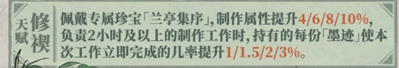 专属珍宝「兰亭集序」建议尽早入手。若未装备该珍宝,则「修禊」仅保留制作属性加成效果,缺失关键的即刻完成概率增益,整体强度明显削弱。资源紧张时,可优先升级「入木」天赋,因其产量提升与补货折扣两大收益无需依赖珍宝即可稳定生效。