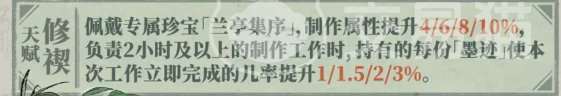 第二项天赋「修禊」需与专属珍宝「兰亭集序」配合激活完整效果。装备该珍宝后,王羲之的基础制作属性提升4%–10%(随天赋等级递增);此外,在执行≥2小时的制作任务过程中,每持有1点「墨迹」,本次任务即刻完成的概率额外提升1%–3%。若「墨迹」达满额4点,则最高可叠加至12%的即时完工率——这一概率在中长期生产场景中具备明确战术价值。