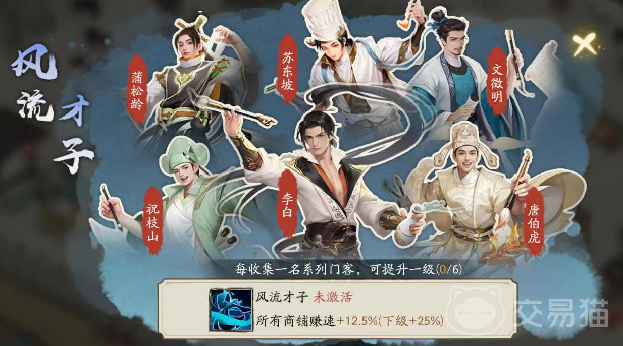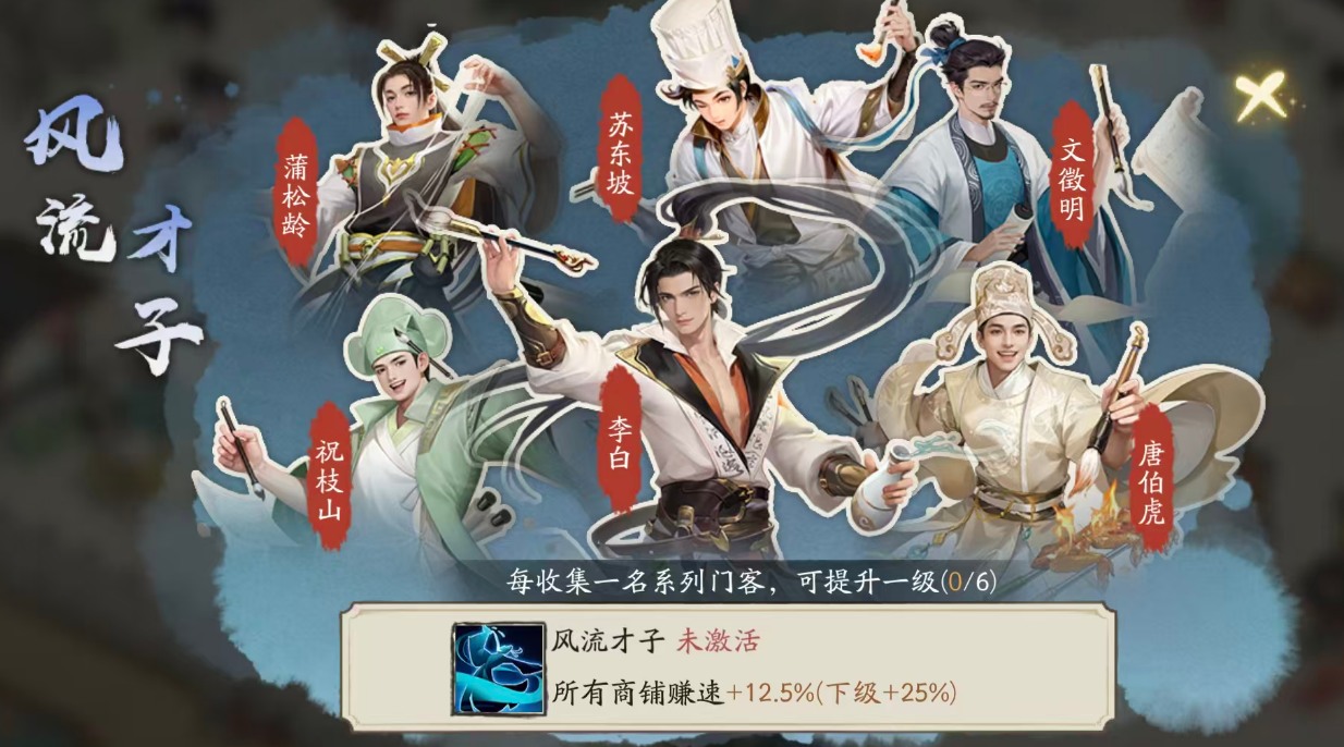 除基础加成外,苏东坡还承载丰富的剧情互动内容。玩家与其交互将触发专属诗词事件,完成任务后可领取对应经济奖励;同时,在客栈场景中启用其问答玩法,还能有效提升顾客驻留时长与人气值。此外,苏东坡是“风流才子”羁绊的关键成员之一——该羁绊需集齐6位指定门客方可激活,其余5位为蒲松龄、祝枝山、李白、唐伯虎、文征明。其中祝枝山支持通过付费途径直接获取,其余角色均出自同一扭蛋池。