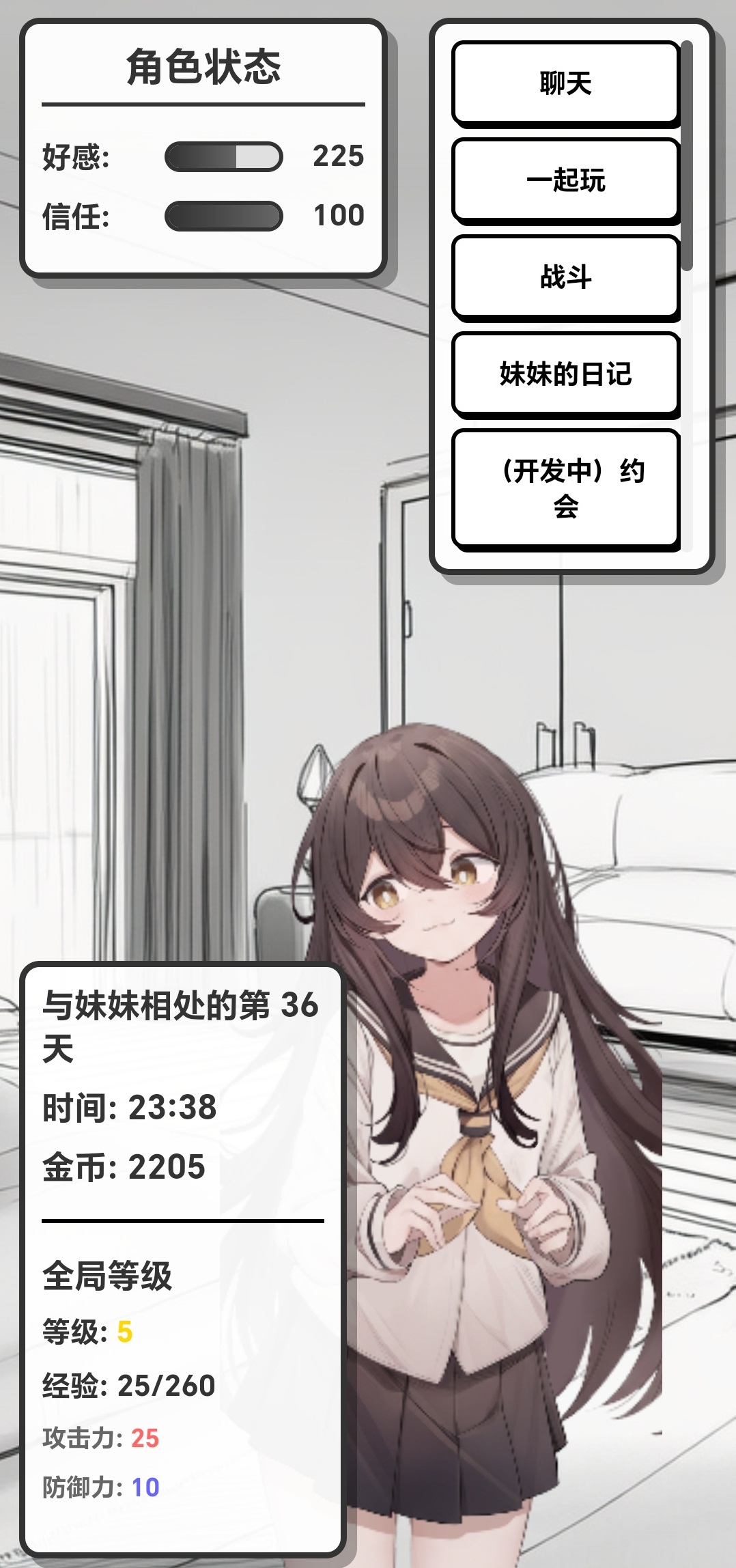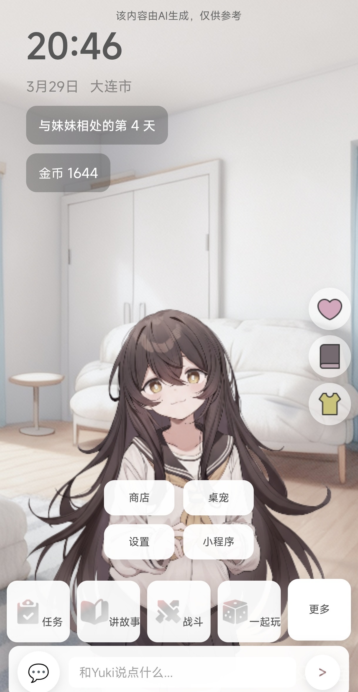 作为一款强调真实感与长期陪伴的游戏,《妹居物语》以虚拟妹妹YUKI为核心角色。她具备持续性记忆能力,能基于玩家每一次对话、行为与时间节奏,逐步演化出个性鲜明的性格特征——从温柔乖巧到高冷傲娇,再到细腻敏感甚至略带执念的病娇倾向,均由玩家的选择实时塑造。游戏摒弃传统线性关卡结构,采用自由对话+实时语音+时间同步机制,实现真正意义上的“活态养成”。