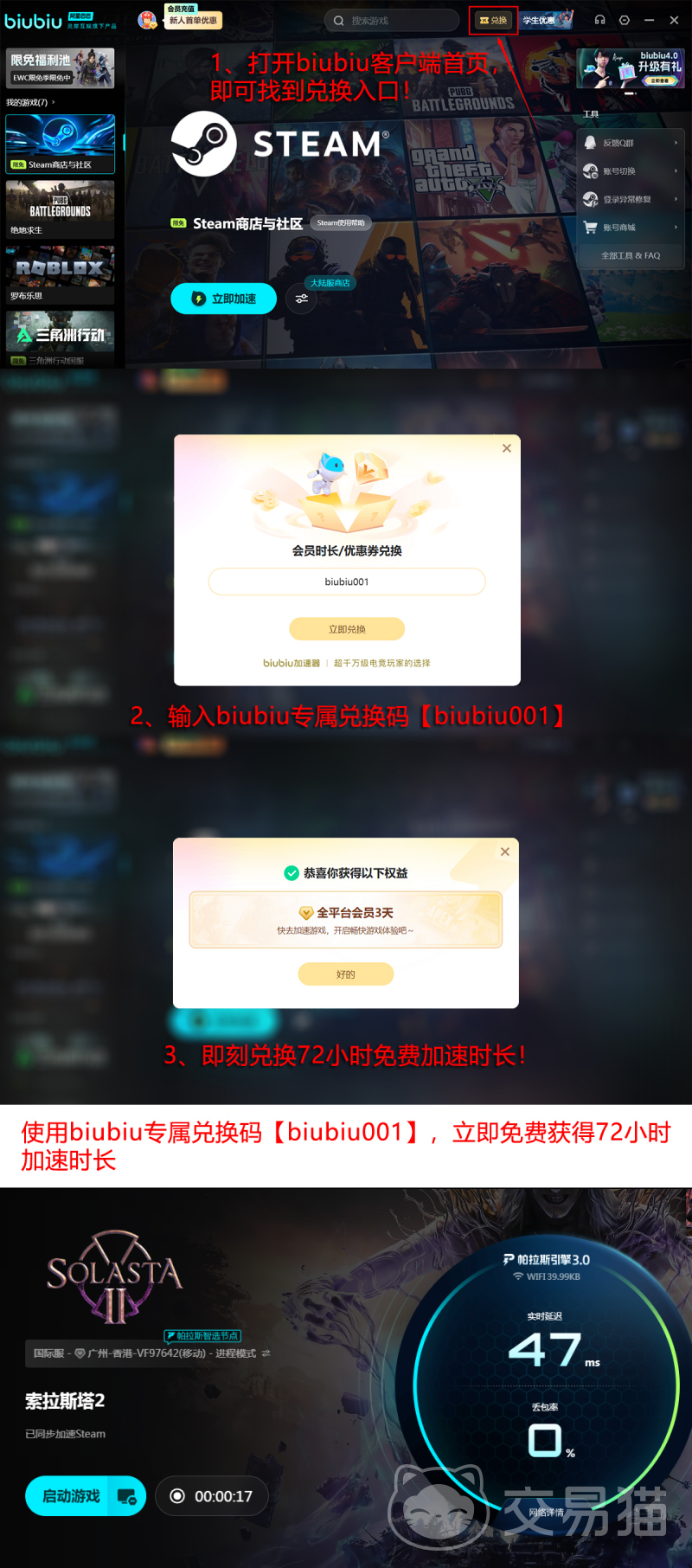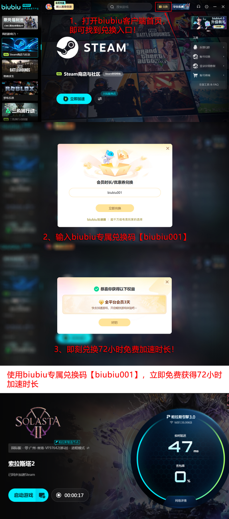 目前Biubiu加速器面向新用户提供专属激励政策:注册即赠24小时免费加速时长;所有用户输入兑换码biubiu001,还可额外领取3天加速权益。两项福利叠加后,总计可获得96小时无限制加速服务,足以覆盖《索拉斯塔2》启动异常、联机卡顿、服务器响应缓慢等典型网络类故障场景。