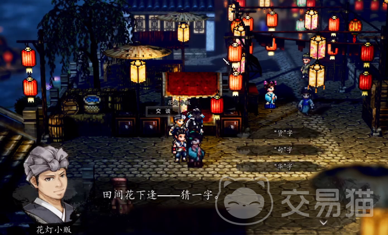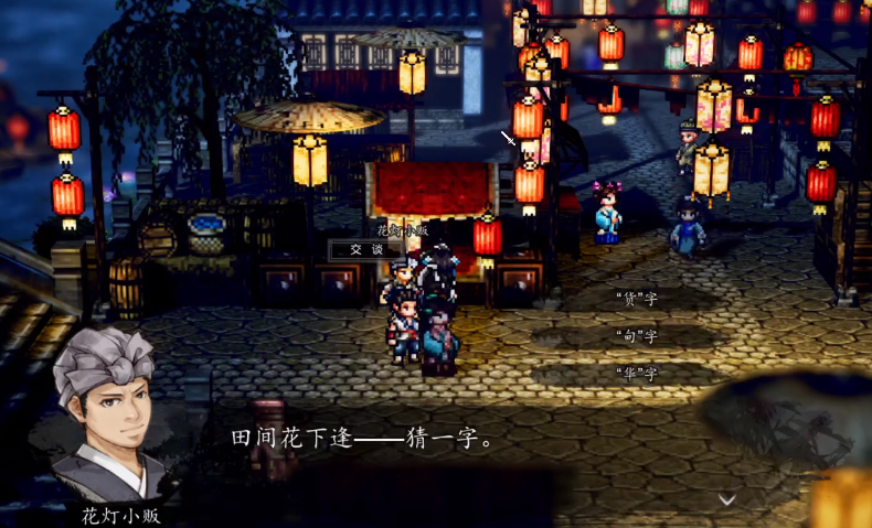 抵达姑苏城后,沿小桥向右行进即可定位灯谜大会摊位。此处由一名小贩主持四道字谜挑战,全部答对为通关前提。谜题及标准答案如下: 第一题谜面“田间花下逢”,答案为“华”; 第二题谜面“秋日香飘云水间”,答案为“灯”; 第三题谜面“泱泱流水月分明”,答案为“映”; 第四题谜面“雨后残阳”,答案为“雪”。 成功解出全部谜底后,玩家将获得道具【琉璃莲花灯】,赠予欧阳雪可额外提升10点好感度。