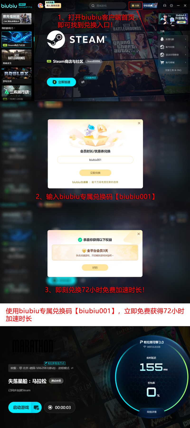 目前新用户注册即可获赠24小时免费加速时长;所有用户输入兑换码biubiu001,还可额外领取三天加速权益。两项福利叠加使用,总计可享96小时无门槛加速服务。