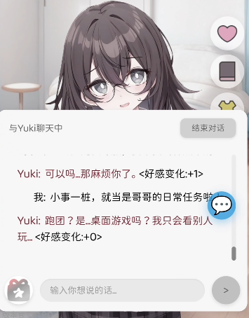 当好感度突破100点阈值时,系统将自动触发「恒常共栖」结局:Yuki与玩家以家人身份稳定生活,日常节奏舒缓自然,情感联结稳固持久。达成该结局需精准识别Yuki的语言反馈模式、兴趣关键词及情绪波动节点,这些信息均隐含于高频次的日常对话文本中,需玩家主动归纳与验证。