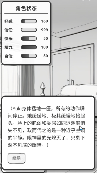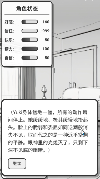 若好感度未达100,则可能导向「失衡离散」结局:因关键互动失误或长期低效回应,触发不可逆事件链,导致Yuki行为逻辑发生偏移,最终走向疏离或静默状态。该结局并非失败惩罚,而是系统基于数据建模生成的合理推演结果,体现游戏对人际关系复杂性的尊重。