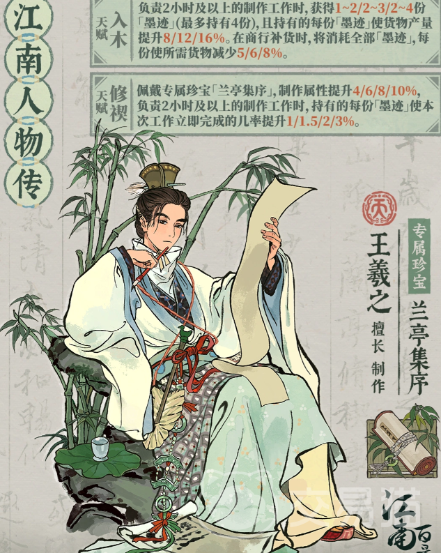 江南百景图王羲之人物介绍与玩法解析|江南百景图王羲之技能属性、获取方式及建筑加成全攻略