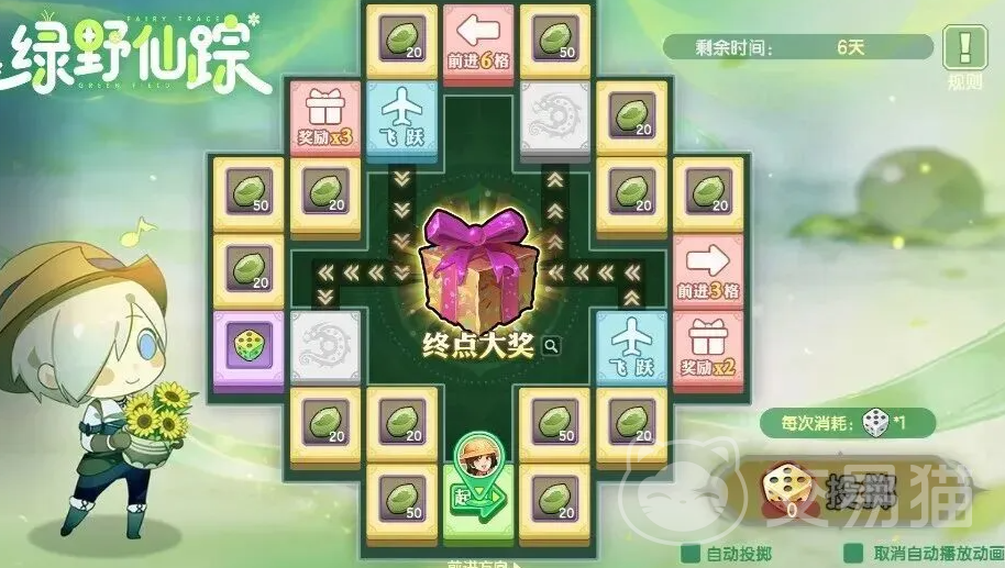 “绿野仙踪”为策略性行棋玩法,需消耗踏青骰子推进角色前进。地图包含常规积分格与特殊事件格,每步均可获得不等量踏青积分;抵达终点固定奖励200点积分,部分特殊格子额外提供限定外观、限时称号或稀有材料。