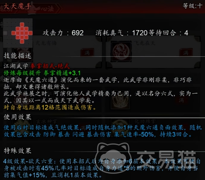 招式搭配建议以“大天魔手”为起手式,衔接“无相劫指”强化控制衔接,再以“赤炎阳神掌”完成爆发收尾,构成标准三段式输出链。备选方案中,“摔碑手”提供额外破防效果,“火云神掌”增强范围灼烧持续伤害,“截脉三式”则在打断与减速层面具备不可替代性,三者可根据副本机制灵活轮换。